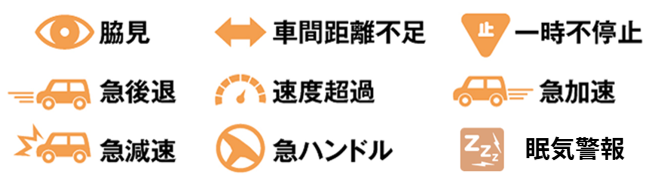 日々の運転の中からAIが右記の9つのシーンを自動検知します。人間に代わってAIが一定の閾値を元に危険運転を検知することで、客観的な基準に基づいた指導が可能になります。指導者からは「人間が映像を確認していた時よりもドライバーが聞き入れてくれるようになった」と好評いただいています。