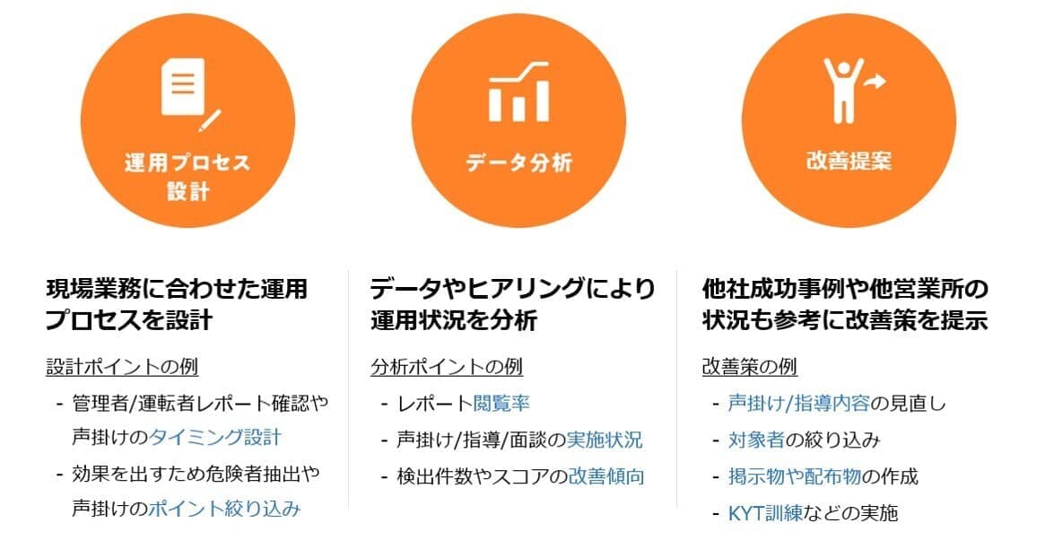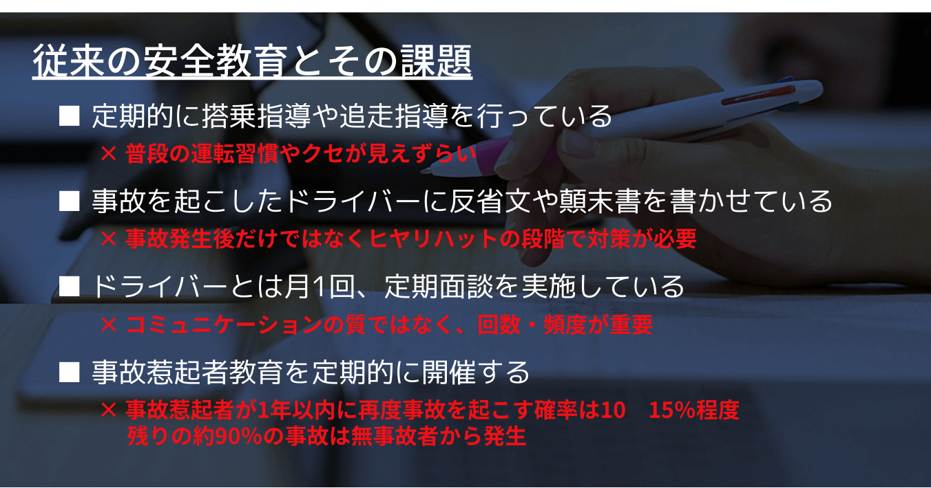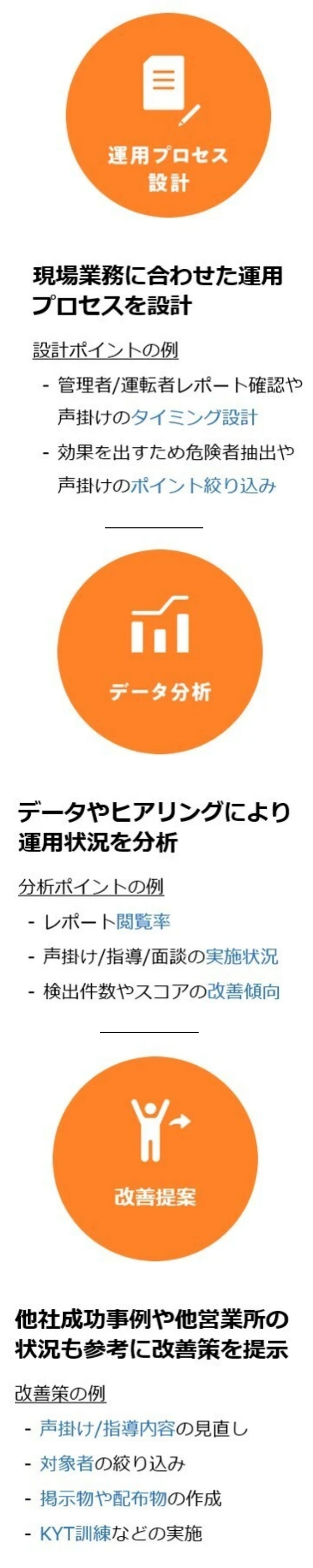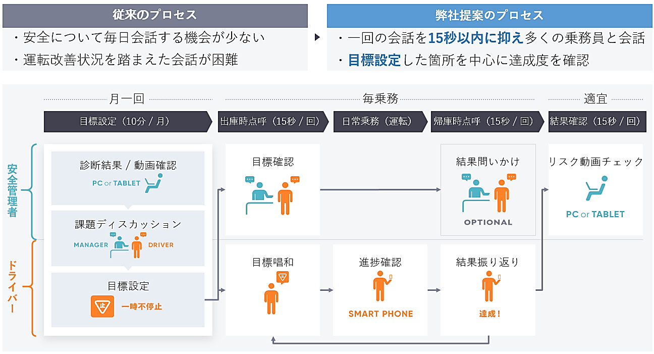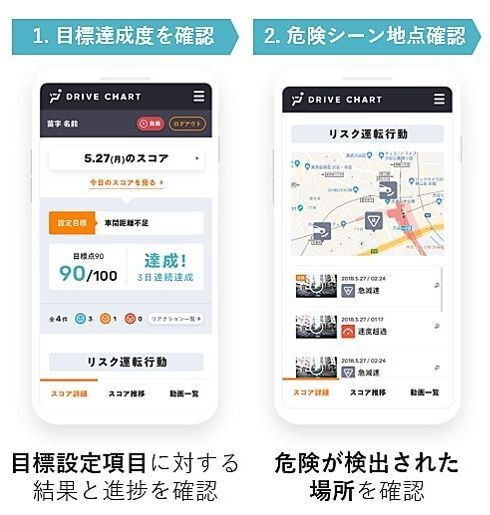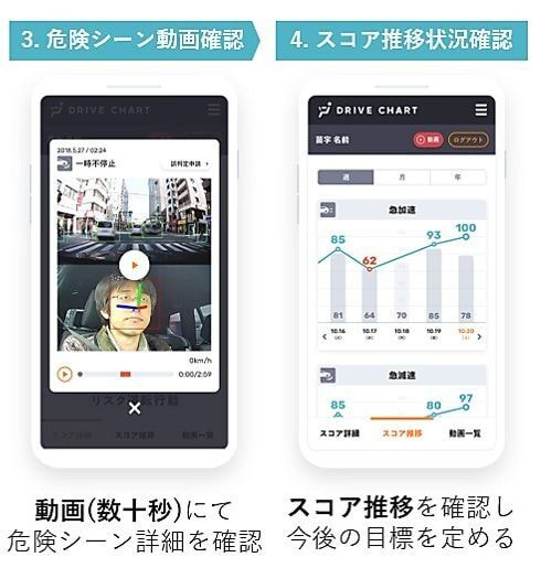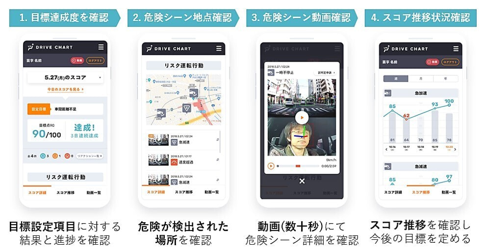 日々の振り返りの中で、目標を再確認し、危険シーンの数やスコアの推移で改善を実感できます。危険が検出された地点の情報と動画を確認することで自分の運転行動を振り返ることができ、当事者意識を持たせることが可能です。
