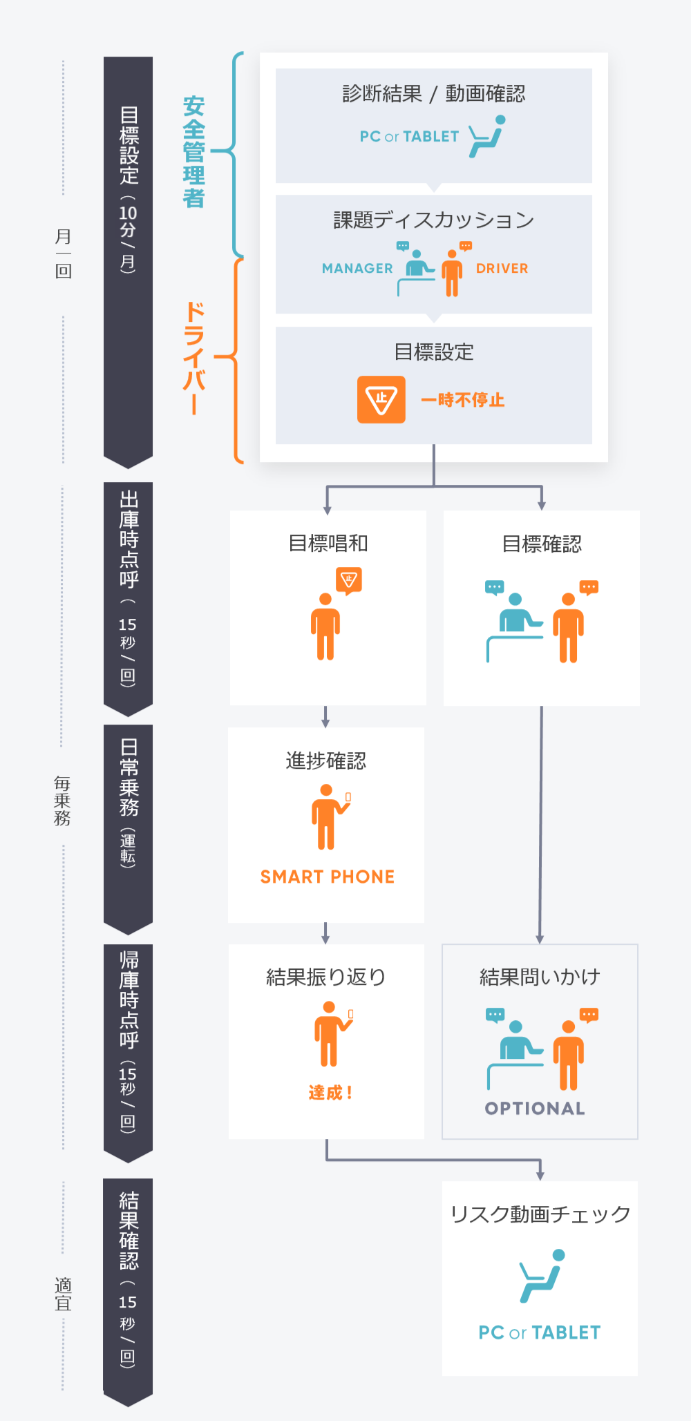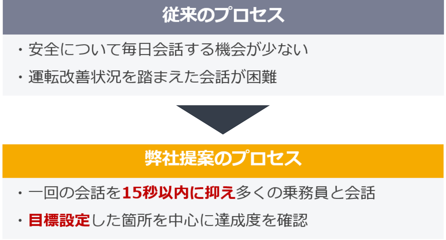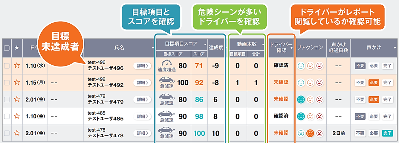 目標未達者や注視しているドライバーの運転状況を一目で把握できます。 ドライバーへの声掛けポイントを容易に把握でき、コミュニケーションを起こすきっかけになります。